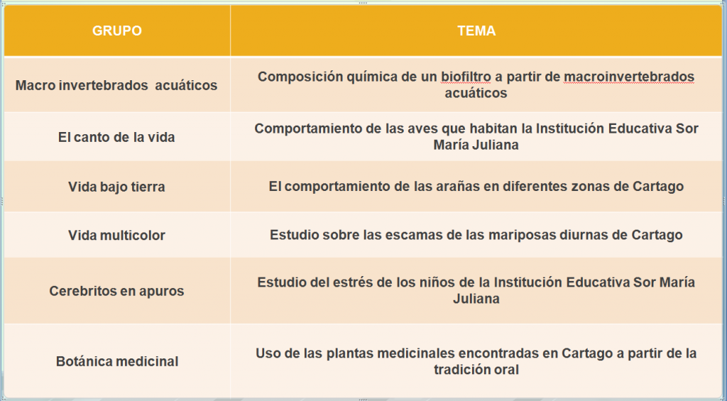 Actualmente se encuentran vinculados al programa Investigón y Preguntina, 25 integrantes entre niños y niñas de diferentes grados y edades. De igual forma, se encuentran acompañados por 5 asesores de la Corporación de Estudios Tecnológicos del Norte del Valle y 2 docentes de la Institución Educativa Sor Maria Juliana. Dentro de los proyectos que se estan desarrollado, se encuentran: